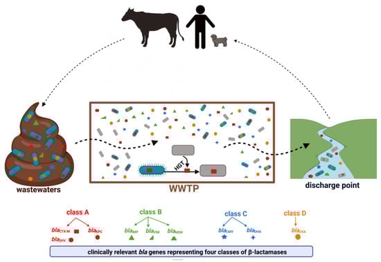 According to the β-lactamase database (available online: BLDB; http://bldb.eu/ accessed on 23 May 2022), these enzymes constitute a very heterogeneous group with more than 7000 genetic variants identified. Within each of the four classes (A, B, C, and D), β-lactamases of particular clinical importance can be distinguished. These are detected consistently in environmental niches, including WWTPs (Figure 3) [41].