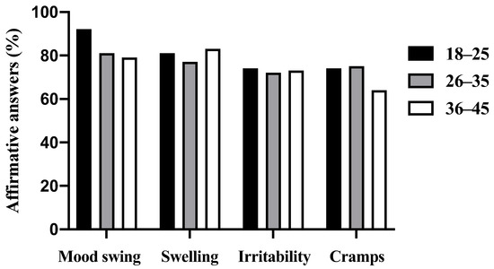 We received 335 responses. However, after applying inclusion and exclusion criteria to the responses, 25 were discarded, and 310 were considered valid and used in the analysis. Regardless of the age group, the majority of participants presented symptoms of MC (99%). Specifically, 100% of the 18–25 age group, 98% of the 26–35 age group, and 99% of the 36–45 age group had pre-menstrual symptoms, with no difference between each age-group (2 = 2.35, p = 0.308). The most cited symptoms in each age-group are presented in Figure 1. Mood swings (84%), swelling (80%), irritability (73%), and cramps (72%) were the most cited symptoms and were felt by over two-thirds of the participants. Specifically, the main symptoms felt by women in each age-group were: 18–25 age group (92% mood swings; 81% swelling; 74% cramps; 74% irritability); 26–35 age group (81% mood swings; 77% swelling; 75% cramps; 72% irritability); 36–45 age group (83% swelling; 79% mood swings; 73% irritability; 64% cramps).
