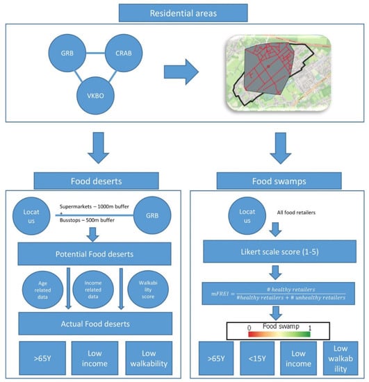 Technical roadmap of the research. Firstly, the residential areas in Flanders are identified. Secondly, the food deserts and food swamps are determined within these residential areas.