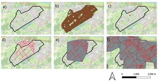 Procedure to create the residential areas. A census tract (a) was filtered to only contain the points of the modified CRAB database, depicting the residential addresses (b). The geometric center of gravity was calculated for these points (c). Next, the 1000 m road distance from the geometric center of gravity was calculated (d). A buffer containing the 1000 m road distance measurement was created, resulting in the residential areas (e). This procedure was carried out for each census tract in Flanders with residential buildings (f). Note that the residential areas often overlap.