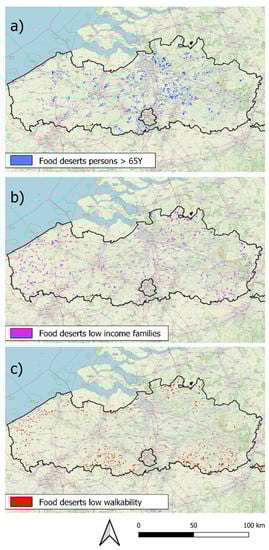 The geographical dispersion of food deserts in Flanders (data 2020). (a) Food deserts in areas with a high number of people >65Y; (b) food deserts in areas with a high number of families with low income; (c) food deserts in areas with low walkability.