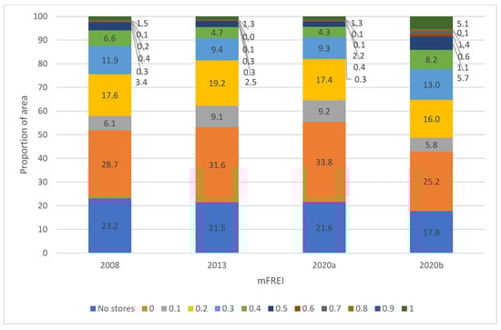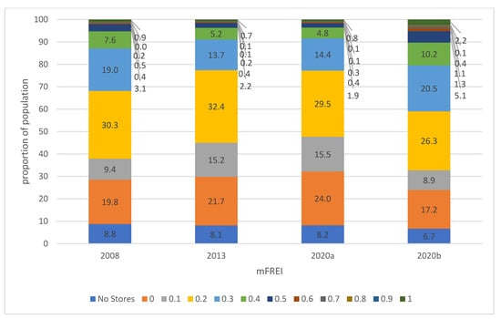 When comparing the year 2020, to results with (2020b) and without (2020a) the dataset of community gardens, farmers’ markets and farmers’ outlets, a strong difference is seen both in Figure 5 and Figure 6. Because community gardens, farmer’s markets and farmers’ outlets were all classified as healthy (Likert scale allocation 5), both the residential area and the percentage of the population living in that area with low mFREI scores (<0.5) decreased, while the residential area and percentage of the population living in areas with high mFREI scores (>0.5) increased significantly. For example: when including the dataset of community gardens, famer’s markets and farmers’ outlets, healthy retailers outnumbered unhealthy retailers (mFREI >0.5) on 8.4% of the area, with 5.2% of the population living in that area. Without the extra dataset, this number drops to 2.1% of the area and 1.6% of the population.
