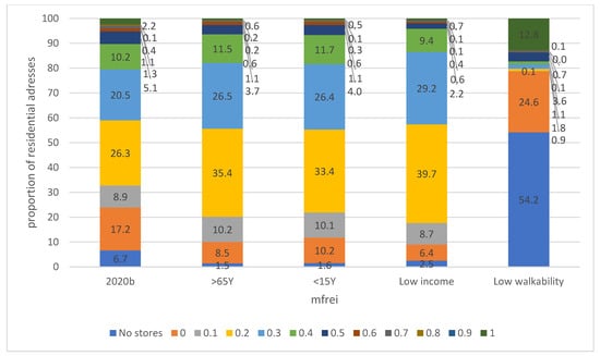 Food swamps in residential areas with a lot of people > 65 years and younger than 15 years; for people with low incomes and regions with low walkability for the year 2020, data includes farmers’ shops and community gardens. 2020b is identical, as in Figure 6, and is added for comparison purposes. The mFREI scores are expressed on a population basis.