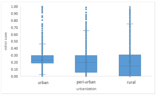 The geographical distribution of food swamps in 2020 is shown in Figure 8 and the mFREI scores according to the level of urbanization are shown in Figure 9.