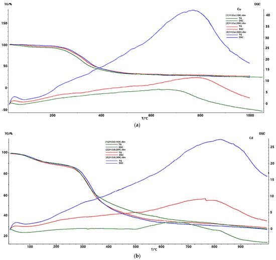 As an important means of characterization, thermal analysis is a method to analyze the composition and thermal stability of the tested materials by temperature programming, causing changes in their physical and chemical properties to obtain a series of data. Differential scanning calorimetry (DSC) and thermogravimetry (TG) are two commonly used thermal analysis methods. TG is a method for analyzing the relationship between the mass and temperature of the sample to be tested, while DSC is a method for analyzing the relationship between the endothermic or exothermic rate of the sample to be tested and the temperature [33,34]. Figure 3 is the TG-DSC curve of the absorption of copper, cadmium and nickel ions by Microcystis aeruginosa. The TG changes in Figure 3a–c show that the absorption of heavy metal ions by Microcystis aeruginosa has three obvious weight loss processes: weight loss at about 100 °C, mainly due to the volatilization of residual water in algae powder; weight loss at 200~400 °C is mainly caused by the combustion of easily degradable substances and semi-volatile components (such as carbohydrates, aliphatic structures, carboxyl groups, etc.) and hemicellulose, cellulose, microbial cell wall and other substances. A total of 400~600 °C weight loss, mainly due to the high molecular weight of aromatic and polycyclic structures, such as lignin, humic acid substances caused by the combustion. As shown in Figure 3a–c, the DSC curve of M. aeruginosa absorbing copper, cadmium and nickel ions has an obvious endothermic and exothermic peak at 500~900 °C, and with the increase in heating rate, the peak moves to the right and moves in the high temperature direction. This indicates that the adsorption of copper, cadmium and nickel ions by M. aeruginosa powder leads to the formation of an exothermic peak on the DSC curve. Adsorption of heavy metal ions copper, cadmium and nickel after the energy is greater than before adsorption; the algae cell adsorption process is an endothermic reaction [35,36].