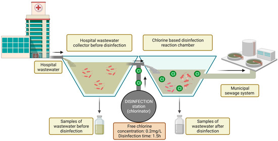 The study was conducted in a hospital in north-eastern Poland. The hospital is located in a suburban area, and it treats patients with respiratory diseases. The hospital has approximately 200 beds in eight wards. Annual patient volume exceeds 11,000. The hospital has an infectious disease ward, and the effluents must be disinfected in line with Polish law [20]. The hospital has a local disinfection station, which is equipped with a dosing station (chlorinator) and dosing pumps. Wastewater is disinfected by an automated electrolytic sodium hypochlorite (NaClO) generation system. The disinfectant is supplied to the reaction chamber based on the volume of incoming wastewater. The dosing station was programmed to obtain a final concentration of free chlorine in the reaction chamber of 0.2 mg/L of wastewater. Wastewater remains in the reaction chamber for 1.5 h. After this time, the effluent is discharged to the municipal sewage system (Figure 1).