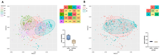 Figure 2. Non-metric multidimensional scaling (NMDS) based on a matrix of clonal similarity of bacterial strains, including a 95% confidence ellipse. Each point represents one bacterial isolate. A heatmap of similarities within and between the studied groups is presented. The barplot (Box-Whisker Plot) of average similarity within and between groups (whiskers denote minimum and maximum values) and the box represent the second and third quartile with the median bar inside. The results are presented for each season (A) and sampling site (B). Legend: AU—autumn, SP—spring, SU—summer, WI—winter, B—before disinfection, A—after disinfection.
