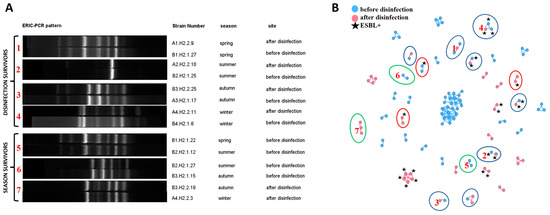 Figure 3. Presentation of clonal relationships: (A) Examples of ERIC-PCR fingerprints of isolates regarded as clones: between sampling sites (disinfection survivors) and seasons (season survivors); (B) Network analyses showing all clonal relationships within the studied isolates. Blue nodes represent strains isolated from wastewater before disinfection, and pink nodes represent isolates from disinfected wastewater. ESBL+ isolates are marked with a black star. The clones identified in isolates from different sampling sites are marked with a blue ellipse. The clones identified in isolates from different seasons are marked with a green ellipse. Clones that differed in ESBL production are marked with a red ellipse. The connections between nodes represent Pearson’s correlation coefficient of ≥97% and the Dice similarity coefficient of 100% (clones). Nodes = 117; Edges = 133. Red numbers in (A) relate to the numbers in (B) and denote the same bacterial relationships.