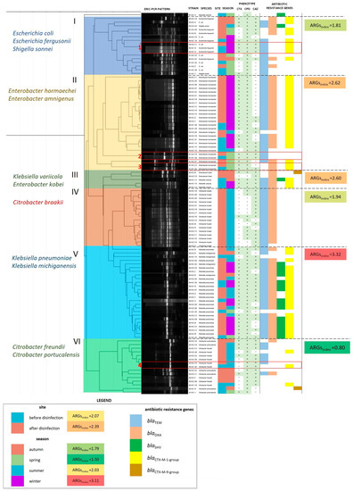 Figure 5. A dendrogram based on the similarity matrix of ERIC-PCR patterns in 104 ESBL+ isolates (similarity method: Pearson’s correlation coefficient; linkage method: UPGMA). The dendrogram was divided into six clusters with different species composition (cluster numbers and species names are presented on the left side of the dendrogram). Strain characteristics are presented on the right side of the dendrogram: isolate identifier, species, site and season of isolation, phenotypic characteristics of ESBLs, and the presence of ARGs. The ARGindex was calculated for each cluster, season, and sampling site as the mean number of ARGs per bacterial isolate in each group. ESBL+ isolates from different sampling sites, characterized by identical ERIC-PCR profiles, are presented in subgroups in red boxes and are numbered from 1 to 4.
