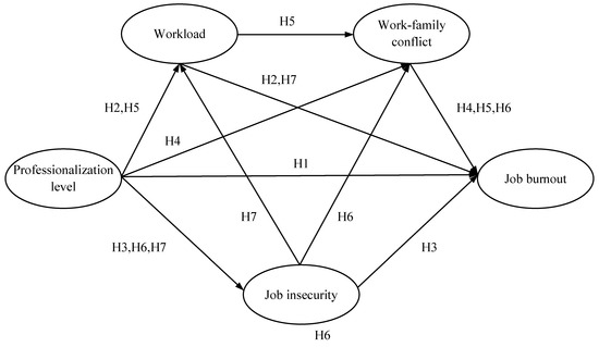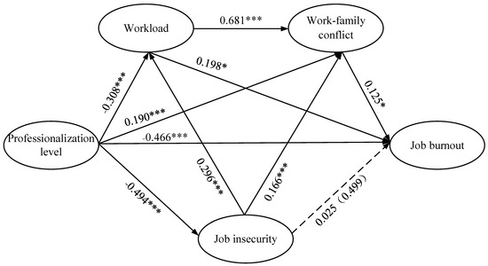 3.6. Professionalization, Job Insecurity, Work–Family Conflict, and Job Burnout