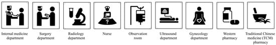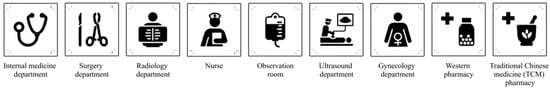 After all designs were developed, three experts were invited to comment on the designed symbols. After several rounds of revisions based on the experts’ opinions, the final “internal medicine department” design was obtained. Figure 5 shows the designs of the nine healthcare symbols that were developed in this study.