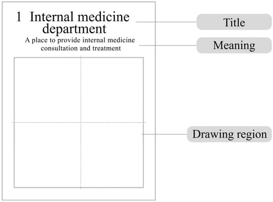 The symbols for medical treatment and healthcare regulated by the National Standard of the People’s Republic of China [] were implemented only in October 2021. As there was no report on public identification and testing, we selected nine wayfinding signs for healthcare as experimental materials in this study. These signs showed basic information about some of the major departments in a healthcare environment, including “internal medicine department”, “surgery department”, “radiology department”, “nurse”, “observation room”, “ultrasound department”, “gynecology department”, “western pharmacy”, and “traditional Chinese medicine (TCM) pharmacy”. Figure 2 shows the specific symbols and names selected in this study. Figure 3 shows an example of the experimental materials, including a drawing paper for users at the first (creation) stage that contains a title, a description of the title, and a drawing area of 8 × 8 cm2. The drawing area is divided into 2 × 2 squares by the central axes.