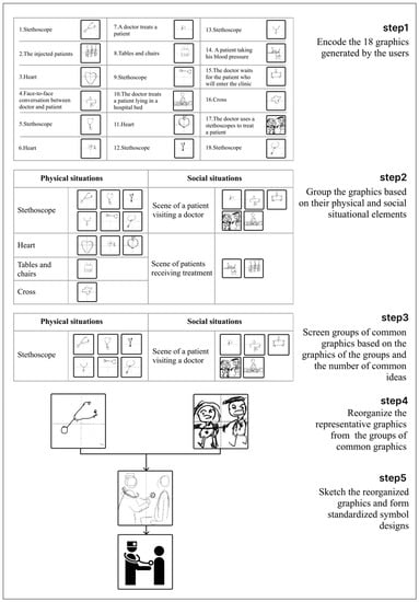 After eliminating the drawing papers with no responses or only plain text responses, a total of 174 graphics for the nine symbols were obtained at the end of the first stage (i.e., creation). Both pure graphics and graphics marked with a small amount of text were defined as valid responses. Figure 4 shows the process of extracting the common graphics for a healthcare symbol, specifically for a “internal medicine department”, and the developing of the designs. The designers had to accurately extract the common graphics. They combined the recorded ideas of the individual users with their drawings in order to encode the graphics that were based on physical situations (e.g., characters involved in the situations, medical equipment, and medical environments) as well as social situations (e.g., doctor–patient interaction scenarios) and subsequently divided the drawings into six groups. Among these six groups of drawings, the “stethoscope” group and “scene of a patient visiting a doctor” group contained obvious situational features and had many graphic responses. Therefore, these two groups were extracted from the six groups to form a group of common ideas under the title of the “internal medicine department”.