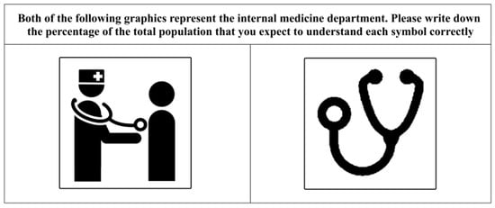 The experimental materials included printed paper materials containing nine groups of healthcare symbols before and after optimization (representative examples are shown in Figure 2 and Figure 5), with the symbol titles and descriptions marked on the top of the papers (Figure 6). Two symbol variants (with the same meaning) before and after optimization were put in the same group and were randomly arranged in the left and right columns. According to the judgment test criteria, these 77 participants were required to estimate the percentage of the total population (0–100%) that may understand each symbol variant correctly [,], followed by writing the judgment value (estimated percentage of the total population) in the blank space next to each symbol variant.