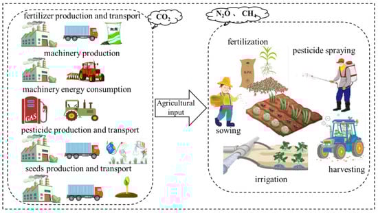 Total GHG emissions from agricultural inputs in the carbon equivalent (CEinput j, kg CO2-eq · ha−1) for crop j were estimated using the equation: