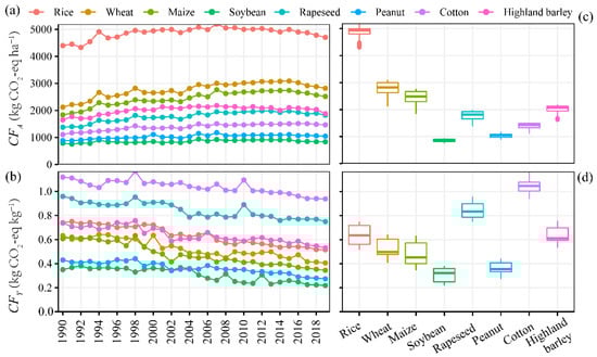 The carbon footprint per unit area (CFA) showed significant differences for different crops regardless of interannual variation (Figure 2a), which were highest for rice (4333–5195 kg CO2-eq · ha−1), followed by wheat (2123–3091 kg CO2-eq · ha−1), maize (1838–2766 kg CO2-eq · ha−1), highland barley (1653–2182 kg CO2-eq · ha−1), rapeseed (1378–1984 kg CO2-eq · ha−1), cotton (1109–1516 kg CO2-eq · ha−1), peanut (878–1178 kg CO2-eq · ha−1), and soybean (753–940 kg CO2-eq · ha−1). Generally, the CFA for all major crops showed an increasing trend with time, which increased rapidly from 1990 to 1998, slowed down after 1999, and slowly decreased from 2016 to 2019.