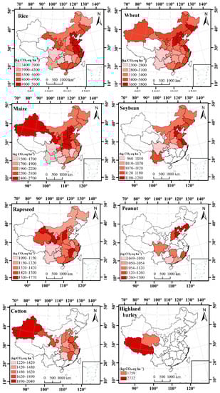 The CFA and/or CFY for all major crops in this study (Figure 2) were markedly higher than those reported for other countries. For instance, the CFA of wheat was reported to be 350 kg CO2-eq · ha−1 in the UK [19], 110 kg CO2-eq · ha−1 in Denmark [30], and 90 kg CO2-eq · ha−1 in Australia [31], while the CFA of rapeseed was 220–350 kg CO2-eq · ha−1 in Canada [32] and the CFA of cotton was 350–370 kg CO2-eq · ha−1 in Australia [33]. On the other hand, the CFY of rice was reported to be 0.07–0.10 kg CO2-eq · kg−1 in the USA [34], while the CFY of wheat was 0.07–0.14 kg CO2-eq · kg−1 in Canada [35]. The CFY of maize was 0.06 kg CO2-eq · kg−1 in the USA [36] and the CFY of cotton was 0.43–0.48 kg CO2-eq · kg−1 in Australia [33]. Higher CFA and CFY values in China provide a greater potential for mitigating GHG emissions in Chinese cropland.