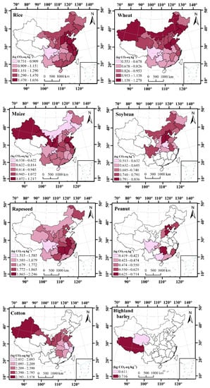 - Xu, X.; Lan, Y. Spatial and temporal patterns of carbon footprints of grain crops in China. J. Clean. Prod. 2017, 146, 218–227. [Google Scholar] [CrossRef]