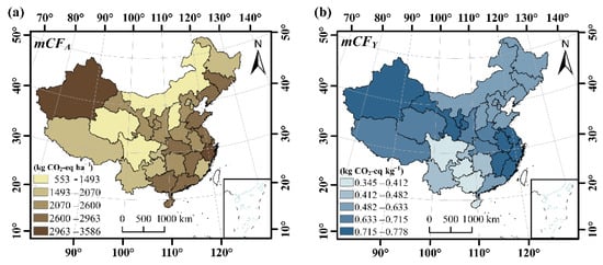 Furthermore, the total mean carbon footprint per unit area (mCFA, kg CO2-eq · ha−1) and CF per unit yield (mCFY, kg CO2-eq · kg−1) for each province were calculated using the equations by considering all the crops together: