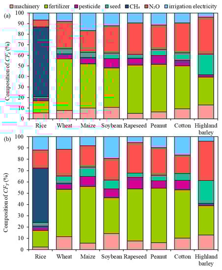 Our results show that the CFA values of rice, wheat, and maize are generally higher than those of other crops (soybean, rapeseed, peanut, cotton, and highland barley; Figure 2a). Lin, et al. [42] also found that rice, maize, and vegetables were the top three contributors to the grain carbon footprint in 2009. Compared with other dryland crops, CH4 emission from paddy fields is the biggest contributor to the CFA of rice (Figure 6). Rice is the crop with the highest fertilizer application rate, of ~300 kg N ha−1 in China [43], among the eight studied crops. However, it has been reported that N fertilizer application above 225 kg N ha−1 had little, or even a negative, impact on the rice yield and would increase GHG emissions [44]. Zhang, et al. [45] found that a 10% reduction in chemical N fertilizer in paddy fields relative to the current farmer’s application rate (300 kg N ha−1) could realize high yields and N use efficiency as well as low environmental impacts. In addition, rice production consumes more electricity per unit area than other crops for irrigation, which is also an important factor leading to a higher carbon footprint for rice. Solar energy-assisted electricity is suggested as a renewable energy source for irrigation [46].