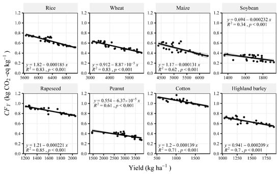 Correlations between the carbon footprint per unit yield (CFY) and crop yield for the study period.