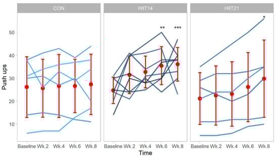 Individual push-ups during the 8 weeks of confinement, monitoring for CON (control), HIIT-14 (14), and HIIT-21 (21). *** (p < 0.001 vs. baseline), ** (p < 0.01 vs. baseline), and * (p < 0.05 vs. baseline). Red dots: Mean values of every week; red bracket lines: standard deviations of the time measure.