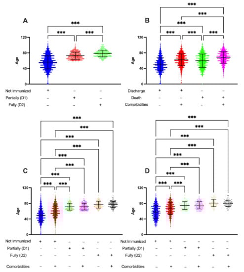 General overview of all analyzed patients according to their age, comorbidities, outcomes, and immunization status. Considering the hospitalizations of moderate and severe COVID-19 cases between April 2020 and August 2021, we analyzed data from 23,516 patients and excluded those hospitalized through direct occupancy, with unknown outcomes, or patients with an unconfirmed COVID-19 case. Based on these criteria, data from 12,635 hospitalized patients were analyzed and cross-referenced with vaccination data. (A) Age of hospitalized patients according to their immunization status; (B) Age distribution of hospitalized patients according to their outcome and comorbidities; (C) Age distribution of discharged patients considering their immunization status and existence of comorbidities; (D) Age distribution of lethal cases considering their immunization status and existence of comorbidities. The statistical analysis was performed using the Kruskal–Wallis test for group comparison and Dunn’s test to perform multiple comparisons. The results are shown as the mean ± standard deviation (*** p < 0.001).