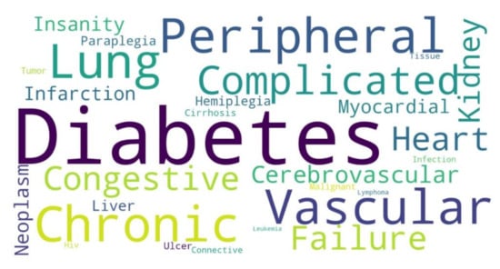 Among the discharged outcome, 8078 patients (93%) were not immunized (NI) during their hospitalization, of whom 65% (n = 5251) had no comorbidity with a mean age of 50 years (vs. mean age of 60 years among those NI with comorbidities), while partially (D1) or fully (D2) immunized discharged patients were equally distributed according to comorbidity criteria. They present a mean age of 70 years. In addition, no case of hospitalization or death was observed among patients under 50 years who received at least one dose of the immunizers, regardless of the manufacturer (Figure 1C). In parallel, 3519 of all deaths (89.11%) occurred in NI individuals and the presence of one or more comorbidities does not significantly change the mean age among groups according to their immunization status. However, age and immunization status appear to be critical variables associated with lethal outcomes, notably when we observed that NI patients are younger (mean 60 years) than partially (mean 71 years) or fully immunized (77 years), independent of the occurrence of comorbidities (Figure 1D). Figure 2 presents the word cloud of the main comorbidities reported among moderate and severe COVID-19 hospitalizations.