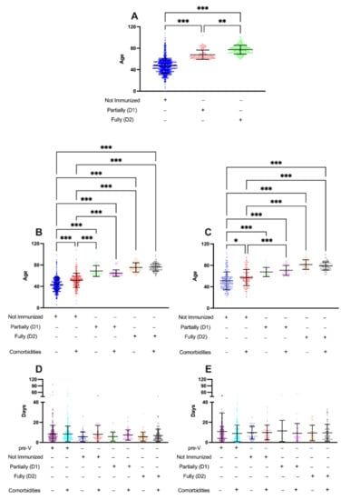 Profile of discharged patients and lethal outcomes related to COVID-19 before and after vaccination. Considering the pre-vaccination (June to August 2020, pre-V) and post-vaccination (June to August 2021, post-v) period, we analyzed the impact of immunization on the profile of hospitalizations and deaths of NI; partially (D1) or fully immunized (D2) patients. (A) Hospitalizations related to COVID-19 during the post-V period; (B) Profile of discharged patients considering their immunization status and existence of comorbidities; (C) Profile of lethal cases considering their immunization status and comorbidities; (D) Days required since admission to hospitalization discharge of moderate/severe COVID-19 patients considering their immunization status and the existence of comorbidities; (E) Days required since admission to lethal outcome of moderate/severe COVID-19 patients considering their immunization status and the existence of comorbidities. The statistical analysis was performed using the Kruskal–Wallis test for group comparison and Dunn’s test to perform multiple comparisons. The results are shown as the mean ± standard deviation (* p < 0.05; ** p < 0.005; *** p < 0.001).