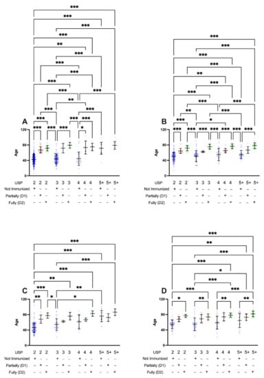 Partially (D1) or fully immunized (D2) patients present lower USP levels, independent of pre-existing medical conditions, indicating that those patients that had at least one dose under 59 years do not require hospitalization and do present a better prognosis when compared with those NI patients (Figure 4A,B). The mean age of NI discharged patients was 42.78 years old, while partially (D1) or fully immunized (D2) patients presented mean ages of 67.38 and 71.65 years old, respectively. As summarized in Table 1, Table 2, Table 3 and Table 4, discharged patients without comorbidities were hospitalized during this period; 85.04% were NI individuals with lower USP levels (2 or 3). In comparison, partially (D1) or fully immunized (D2) individuals represented 3.24% and 4.08% of these individuals, respectively.