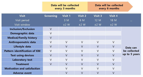 We will collect various clinical data from those who receive KM for weight loss treatment. Anthropometric and laboratory test data gained from RWD will contribute to verify effectiveness and safety of KM for weight loss treatment. Long-term observation of weight will help to predict weight regain that tends to occur within the first 5 years after weight loss. Frequency and results of anthropometric measurements are associated with successful weight control [27]. It is reported that HM complex may be safe for the treatment of obesity compared to conventional medicine or placebos [8]. Laboratory test data will be observed to support the safety of HM in obese patients. Lifestyle changes due to weight loss is another area of concern. Some lifestyle patterns commonly found in obese or overweight patients are associated with weight gain. High calorie intake and low physical activity are main mechanisms of weight gain, and it is essential to observe dietary and physical behaviors of obese patients [28]. In terms of psychology, certain types of depression and obesity may be risk factors for each other [29]. Sleep disorder and fatigue are strongly associated with weight gain. Obesity contributes to poor sleep quality and is associated with hyposomnia and hypersomnia. Endocrine and metabolic changes induced by sleep disorders can contribute to being overweight. High visceral fat in obese patients is associated with increased plasma inflammatory cytokine levels and the risk of sleep apnea, and this causes low sleep quality, high daytime sleepiness, and high risk of cardiovascular diseases [30,31]. Although KM weight loss treatment is widespread in Korea, correlations between lifestyle change by weight loss and the effectiveness of KM therapies are still unclear. Observing various lifestyle factors during weight loss, we expect to discover the correlation among lifestyle behaviors, weight, and KM treatment.