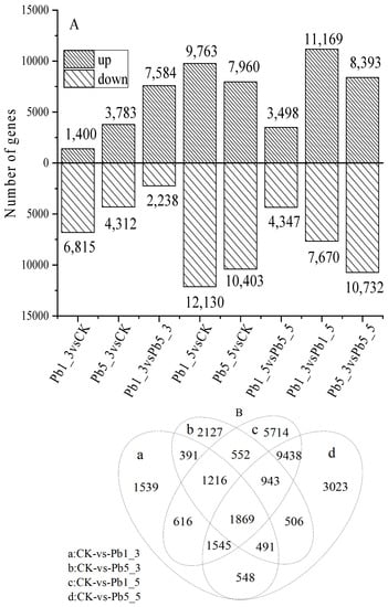 Furthermore, Pb2+ exposure time had a considerabe effect (Figure 1A). A total of 11,169 upregulated and 7670 downregulated genes were differentially expressed in 1.0 mg/L Pb2+ after 3 and 5 days, and 8393 upregulated and 10,732 downregulated genes were differentially expressed in 5.0 mg/L Pb comparisons 3d and 5d. DEGs increased significantly with the increase of Pb2+ stress time, indicating a significant difference in stress time of Pb to C. rupestris, and 1869 common DEGs were found in the Pb1_3vsCK, Pb1_5vsCK, Pb5_3vsCK and Pb5_5vsCK groups (Figure 1B); these DEGs play a key role in the stress process [13].