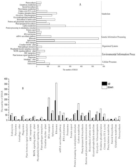 KEGG analysis of the identified DEGs. (A) was KEGG classification of DEGs; (B) was upregulated and downregulated DEGs of every pathway.