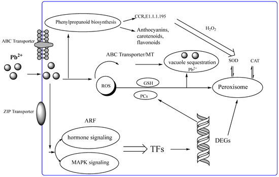 As shown in Figure 4, combined with the above analysis, when Pb2+ entered the cell via a transporter such as ABC transporters and zinc finger protein [15], the metal transporter genes, AtACBP1and AtHMA3, in Arabidopsis are associated with the transportation of Pb [42]; the FLS1 gene plays a crucial role in plant resistance to Pb stress [43].