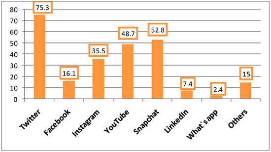 Additionally, among Arab countries, Saudi Arabia ranked first and worldwide, ranked second among WhatsApp and Snapchat users [14]. In the current survey, Twitter ranked first (75.3%), followed by Snapchat (52.8%), YouTube (48.7%), and Instagram (35.5%).