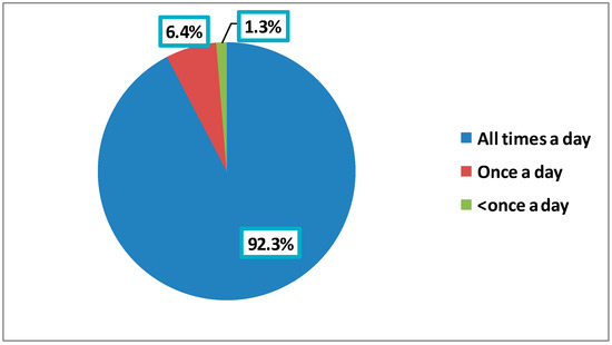 The vast majority of the participants (92.3%) used social media sites all the time, whereas only 6.4% used them once a day (Figure 2). Concerning the importance of an ophthalmologist’s social media site in patients’ decision to be seen by them, 26.9% of the participants considered it not at all important, whereas more than one-third of them (36.3%) considered it either very or extremely important. About half of the participants (49%) reported that the ophthalmologist met their expectations based on his or her social media site either mostly (33.8%) or completely (15.2%), while 23.6% described their expectations as either not at all (10.7%) or slightly (12.9%) being met (Table 2).