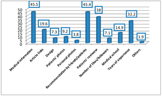 Regarding the important factors of an ophthalmologist’s social media site from participants’ perspectives, medical information written by the ophthalmologist (45.5%), recommendations by friends or patients (45.4%), and patient’s reviews about the ophthalmologist (38%) were the most valued (Figure 3).