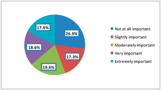 More than one-fifth of females (21%), compared to 16.8% of males, perceived ophthalmologists’ social media sites as extremely important, p = 0.041. A quarter of participants aged between 18 and 24 years, compared to only 5.5% of those aged 65 and above, perceived ophthalmologists’ social media sites as extremely important, p = 0. 018. Almost a third (34.7%) of Master’s or Doctorate holders, compared to 21.4% of diploma holders, perceived ophthalmologists’ social media sites as not at all important, p = 0.011. Having a place of residence in the Kingdom of Saudi Arabia and the reasons for visiting an ophthalmologist were not associated with perceiving the importance of ophthalmologists’ social media sites (Table 4, Figure 4).
