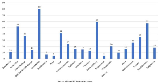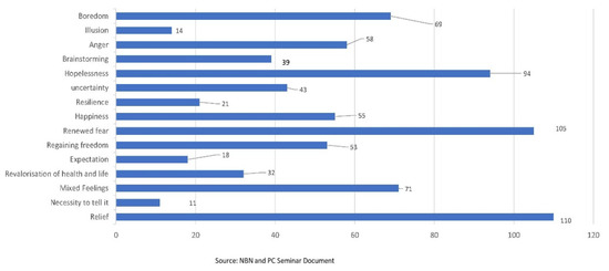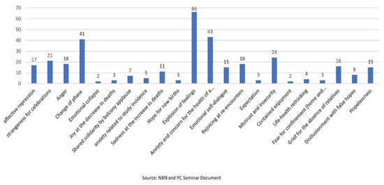 In the discussion during the readings, the students noted that the great variety, both in terms of categories and the expression of feelings, is linked to previous experiences. These pre-confinement experiences function as experiential revelation triggered by reflection, self-reflection, and heteroreflection through NBN and PC (NBN and PC 23, 72, 93, 101, 133, 168, 173) [21,22,23,24]. BNN and PC also contribute to filtering emotional and behavioural responses even in a phenomenon as disruptive as the pandemic [12].