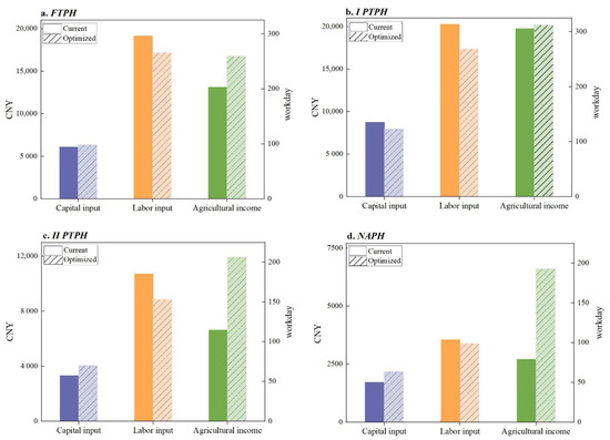 - The current agricultural inputs and production combinations of the different types of peasant households had room for improvement. Target incomes cannot be achieved at the current level of agricultural inputs and must be obtained by adjusting the agricultural inputs and optimizing production combinations. The FTPH must increase the capital input by 268.78 CNY and reduce the labor input by 30.32 workdays, which could increase the actual agricultural income by 3644.73 CNY. The I PTPH must reduce the capital input by 787.64 CNY and reduce the labor input by 44.57 workdays, which could increase the actual agricultural income by 421.22 CNY. The II PTPH must increase the capital input by 746.14 CNY and reduce the labor input by 32.50 workdays, which could increase the actual agricultural income by 5304.04 CNY. The NAPH must increase the capital input by 464.55 CNY and reduce the labor input by 4.66 workdays, which could increase the actual agricultural income by 3904.60 CNY. In general, with the continuous optimization of agricultural inputs and production combinations, the agricultural incomes could be improved as the cultivation of economic crops, such as peanuts, garlic, honeysuckle, and chestnuts, gradually replace grain crops, such as wheat and corn.