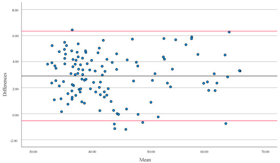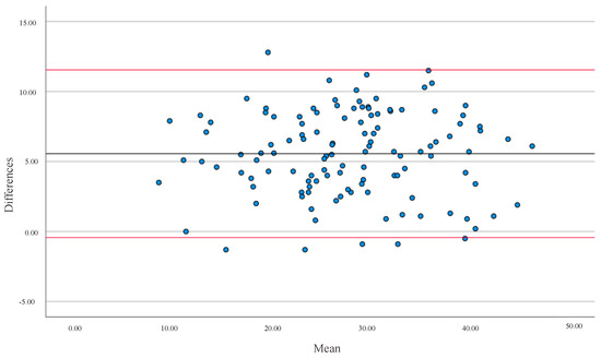- Martin Bland, J.; Altman, D.G. Statistical methods for assessing agreement between two methods of clinical measurement. Lancet 1986, 327, 307–310. [Google Scholar] [CrossRef]