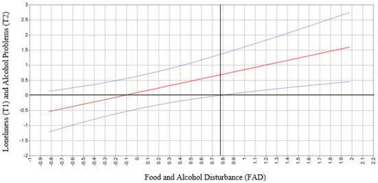 We conducted moderation analyses in Mplus [60] using the ML estimator to determine whether the longitudinal association between loneliness and alcohol-related problems differs based on one’s level of engagement in FAD. We tested whether known risk-factors of alcohol related problems (e.g., age, impulsivity facets) predicted the missingness of alcohol-related problems (T2). These analyses were not significant; therefore, they were not included as auxiliary variables in the model [61]. Mplus manages missing data using full information maximum likelihood (FIML) estimation under the assumption of missing at random, which is robust to missing data and nonnormality [62,63]. Alcohol-related problems (T2) was regressed on loneliness (T1), FAD (T1), and their interaction term (loneliness x FAD) in a comprehensive model that adjusted for alcohol-related problems (T1), alcohol quantity (T1), and sex. We grand mean centered loneliness and FAD to facilitate interpretation. We used the Johnson-Neyman technique [64] to probe significant interactions. Whereas the simple slopes (or “spotlight”) method examines fixed values of the moderator (e.g., −1SD, mean, +1SD), the Johnson-Neyman (or “floodlight”) technique highlights “points along the continuum of the moderator where the effect of the focal predictor transitions between statistically significant and nonsignificant” [65] (p. 928). Researchers have recommended using the Johnson-Neyman technique when all levels of the moderators are meaningful and worthy of consideration [66].