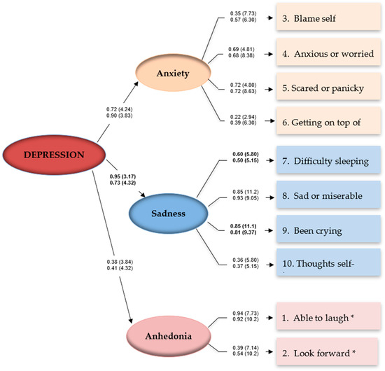 Three-factor model of depressive symptoms, pregnancy and postpartum, Bedouin mothers in Southern Israel. Note: Coefficients for the pregnancy model are above coefficients for the post-birth model. Parameters are expressed as maximum likelihood estimates (standardized solutions). Parenthetical numbers indicate significance levels (CR > 1.96, p < 0.05; CR > 2.58, p < 0.01). * Anhedonia items are reverse-coded.
