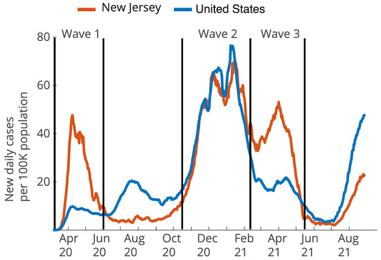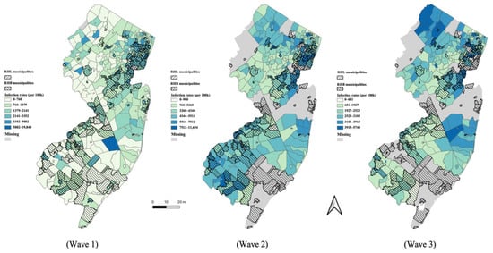Figure 1 portrays the trend of changes using new daily cases reported at the state level in NJ from 1 March 2020 to 31 August 2021. Wave 1 started upon the breakout of COVID-19 in NJ and reached a low point around 1 June 2020. Wave 2 lasted from 15 October 2020 to 10 February 2021. Wave 3 lasted from 10 February 2021 to 15 May 2021. Out of the total of 565 municipalities in NJ, 558 (98.8%) reported data for Wave 1, 406 (71.9%) reported data for Wave 2, and 371 (65.7%) reported data for Wave 3. Explanations for missing data are reported in the prior paper [43].