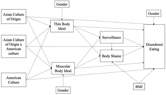 The present study aims to examine the relation between acculturation and disordered eating among Asian American college students, mediated by objectification (i.e., internalization of body ideals, body surveillance, and body shame). Guided by the amended objectification theory, the hypothesized model (Figure 1) was tested. Acculturation is operationalized based on Berry’s theory [6], measured by both the maintenance of Asian culture of origin and the adoption of mainstream American culture. The main effects and the interaction effect between these two cultures were all tested. In addition, both the internalization of thin body ideals and muscular body ideals were included in the model, since recent research has shown that these two body ideals are relevant to both men and women [28,32,33].