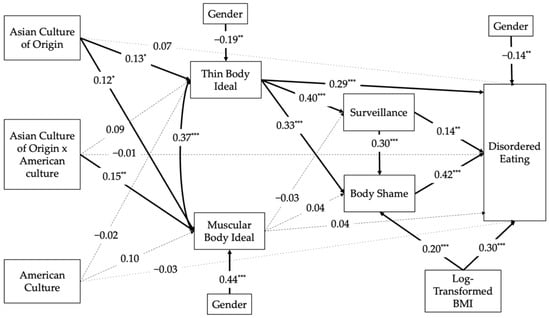 Standardized Model Results of the Relations between Acculturation, Objectification, and Disordered Eating (BMI: Body Mass Index. Solid lines represent statistically significant paths. * p < 0.05. ** p < 0.01. *** p < 0.001).