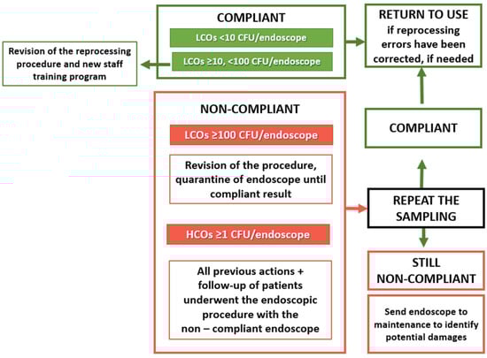 In case of non-compliance, the procedure requires the verification of the reprocessing correct application and a subsequent second sampling. All non-compliant instruments were put in quarantine until a negative result was achieved. In case of persistent non-compliant results, the instrument was sent to the manufacturer’s company, in order to assess the possible presence of micro-lesions of the internal channels. When the number of isolated LCO are >10 and <100 CFU/channels, all mentioned actions are required, except the removal from clinical use, while an LCO load of < 10 CFU/channels does not require any corrective measures (Figure 1).