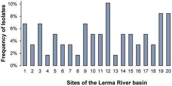 In total, 20 water sources among five states of Mexico (Estado de Mexico, Queretaro, Michoacan, Guanajuato, and Jalisco) were sampled from the upper to lower course of the Lerma River basin, obtaining 59 environmental isolates identified as ß-lactam-resistant-Gram-negative bacteria. The details of the frequency of the isolated strains are shown in Figure 1 according to the water source from which they were obtained, revealing that the highest frequency of Gram-negative bacteria isolates corresponds to the Solis Dam (site 12) in Guanajuato with 10.2%, followed by San Nicolas and Chapala Centro (site 19 and 20 respectively) in Jalisco, which present a frequency of 8.5% each. In addition, we observed a high variation in the number of isolates along the 20 sites that were sampled, as well as low bacterial diversity among the resistant bacteria, in the specific sites where only one strain was obtained (Figure 1 and Figure 2).