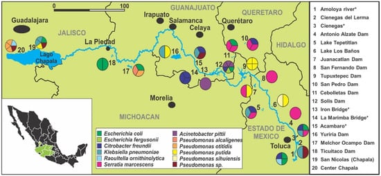 The frequency of MDR in the species identified in the Lerma River showed that C. freundii was the species with the highest MDR, followed by Serratia marcescens, K. pneumoniae, and E. coli. The most affected areas by these MDR strains were the Amoloya River, Ciénegas, La Marimba Bridge, Acámbaro, and San Nicolás, possibly due to the environment being more influenced by agricultural, aquacultural, and industrial activities. In general, the variations in the bacterial groups identified as MDR in freshwater may be due to the difference in the availability of the waste treatment system in hospitals, industries, farms, and other wastewater sources, as well as regional differences with respect to the use of antimicrobials [65].