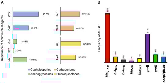 Furthermore, the second most frequent antimicrobial category was represented by fluoroquinolones (Figure 3A), with ciprofloxacin (CIP) and levofloxacin (LVX) presenting resistances of 67.80% and 50.85%, respectively. The ARGs for fluoroquinolone resistance were, consequently, the second most frequent in the strains, with qnrB and qnrS showing 51% and 14% frequencies, respectively (Figure 3B). Finally, resistance to aminoglycosides was the least frequent of all the antimicrobial resistances studied, wherein antibiotic tobramycin (NN) had a resistance of 44.07%, followed by gentamicin (GM) and netilmicin (NET) with resistances of 11.86% and 3.60%, respectively. The ARG aac(6′)lb-cr showed a frequency of 10% among the isolates.